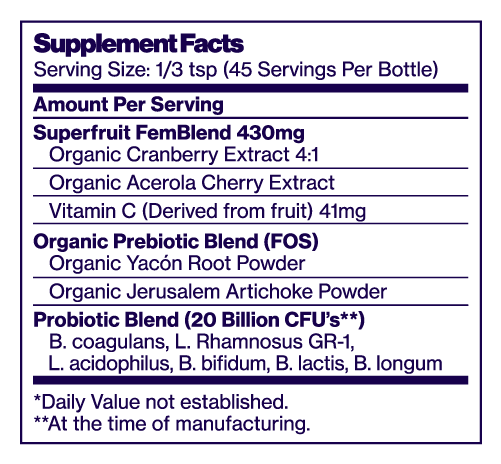 As women, our bodies and wellness needs are intricate and fluctuate throughout time. Our formula is designed to support all aspects of a women's microbiome because everything is interconnected. We use only natural ingredients, including a blend of six scientifically backed probiotic strains and prebiotic fiber to promote a healthy gut. In addition, we've included fruit-based Vitamin C, acerola cherry, and cranberry extracts to support vaginal and urinary tract health.